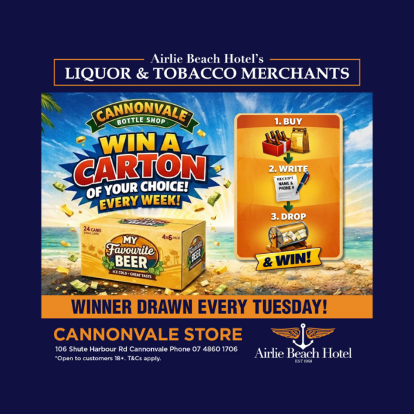 We’re giving one lucky local the chance to win a carton of beer of their choice every week at our Cannonvale Bottle Shop.